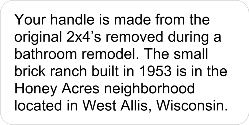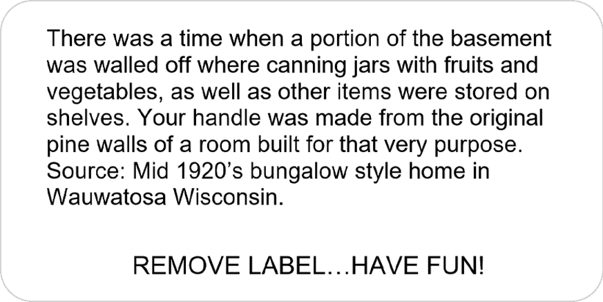 Every Drive Pickleball handle is made from wood that was once used for a different purpose; that’s the definition of reclaimed wood. Each paddle will include a removable sticker like those below indicating the source. If available, a photo of the source is included in the slideshow.